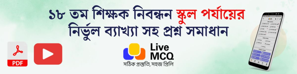 Live MCQ টিমের নিরলস পরিশ্রমে আমরা আপনাদের জন্য ১৮তম শিক্ষক নিবন্ধন স্কুল পর্যায়ের নির্ভুল ব্যাখ্যা সহ প্রশ্নে সমাধান তৈরি করি। আপনাদের সুবিধার্থে নিম্নে ছবি, ভিডিয়ো এবং PDF আকারে ১৮তম শিক্ষক নিবন্ধন স্কুল পর্যায় ও সমপর্যায়ের প্রশ্ন সমাধান দেওয়া হল।