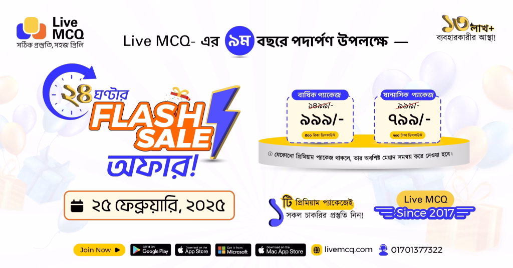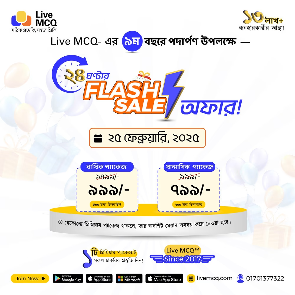 প্রিয় চাকরির প্রত্যাশীগণ Live MCQ টিমের পক্ষ থেকে আপনাদের শুভেচ্ছা। আশা করি সকলে ভালো আছেন, সুস্থ আছেন এবং পড়াশোনার সাথে আছেন। আপনারা জানেন, Live MCQ দেশের প্রথম ও বর্তমানে সর্ববৃহৎ চাকরির প্রস্তুতির অনলাইন প্ল্যাটফর্ম। ২০১৭ সালের ২৭ ফেব্রুয়ারি Live MCQ যাত্রা শুরু করার পর আপনাদের ক্যারিয়ার গড়ার পথে সঙ্গী হিসাবে ৮ বছর পার করে ৯ম বছরে পদার্পণ করেছে। দীর্ঘ এই ৮ বছরের পথ চলায় আপনাদের সাথে আমাদের সম্পর্ক ছিলো পারস্পারিক আস্থা ও ভালোবাসার। এই সম্পর্ককে আরো গভীর করে তুলতে আমরা আগামী ২৫ ফেব্রুয়ারি সারাদিনব্যাপী বিশাল Flash Sale অফার এর আয়োজন করেছি।