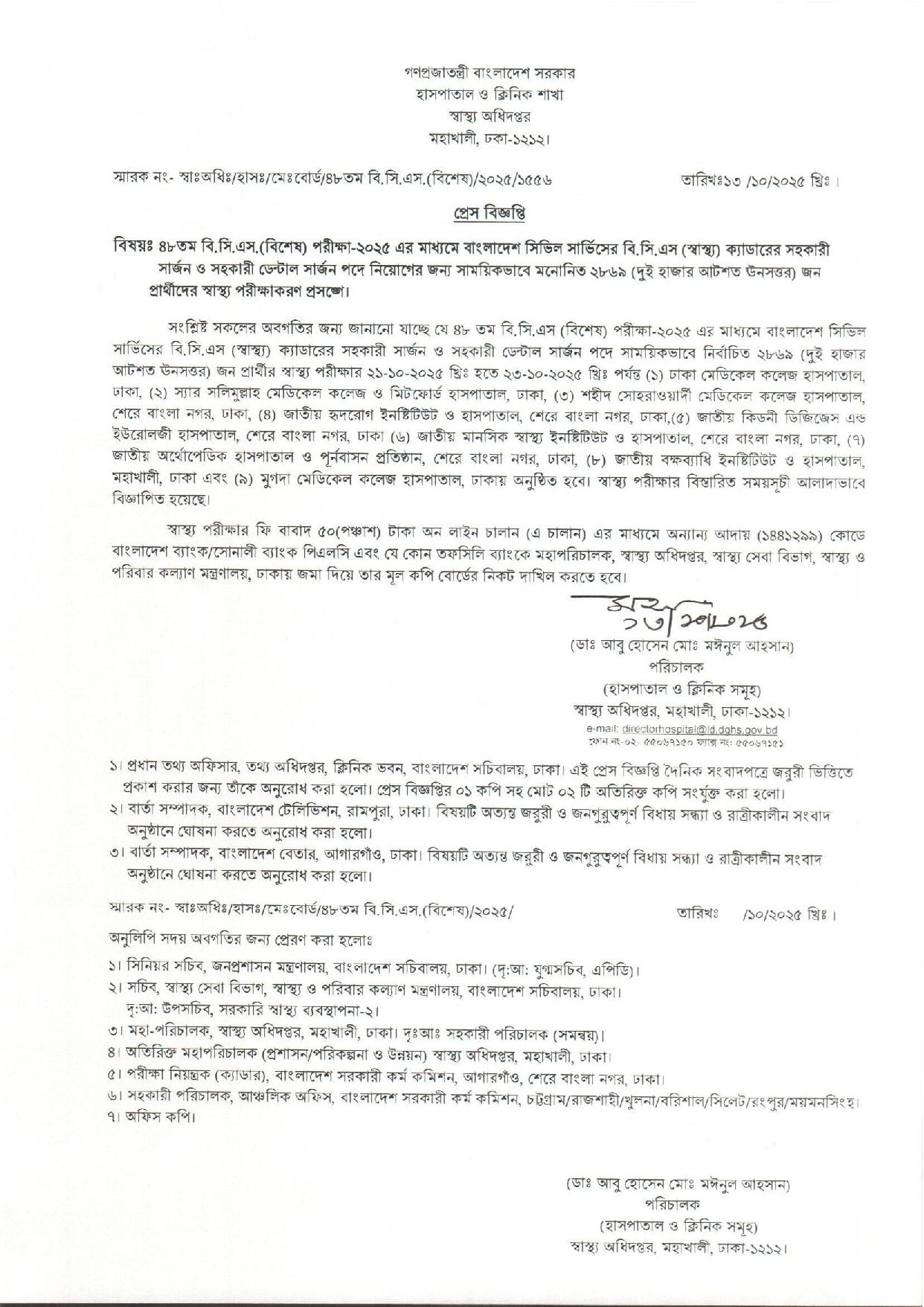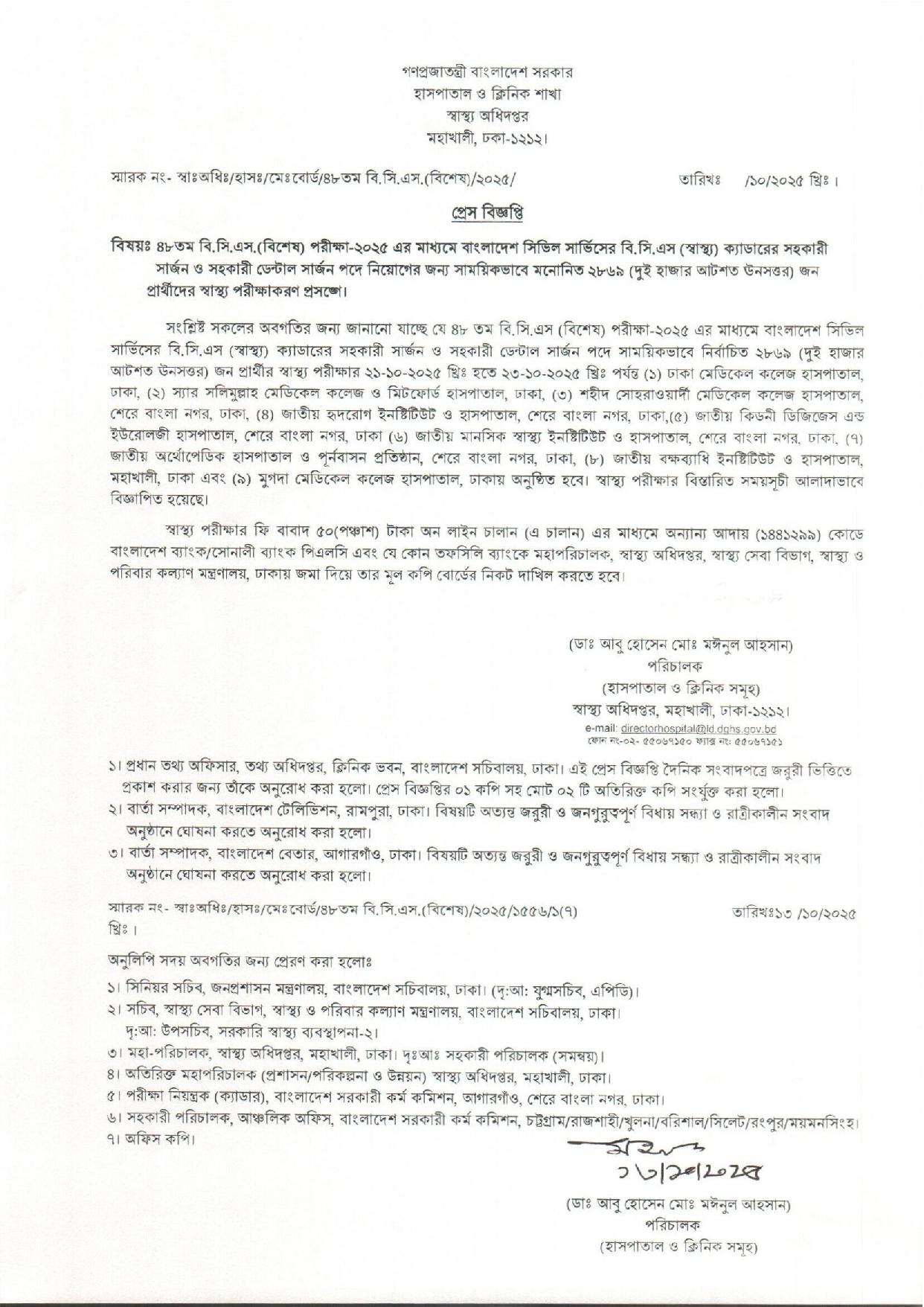 প্রিয় চাকরিপ্রত্যাশীগণ, আপনাদের অবগতির জন্য জানানো যাচ্ছে যে, ৪৮তম বিসিএস স্বাস্থ্য পরীক্ষার সময়সূচি প্রকাশিত হয়েছে। বিজ্ঞপ্তি অনুসারে, ৪৮তম বিসিএস (বিশেষ) পরীক্ষা-২০২৫ এর মাধ্যমে বাংলাদেশ সিভিল সার্ভিসের বিসিএস (স্বাস্থ্য) ক্যাডারের সহকারী সার্জন ও সহকারী ডেন্টাল সার্জন পদে নিয়োগের জন্য সাময়িকভাবে মনোনিত ২৮৬৯ প্রার্থীর স্বাস্থ্য পরীক্ষা আগামী ২১ অক্টোবর থেকে ২৩ অক্টোবর, ২০২৫ তারিখ পর্যন্ত ঢাকার বিভিন্ন হাসপাতালে অনুষ্ঠিত হবে। স্বাস্থ্য পরীক্ষার ফি বাবদ পরীক্ষার্থীদের ৫০ টাকা অনলাইন চালান এর মাধ্যমে প্রদান করতে হবে।