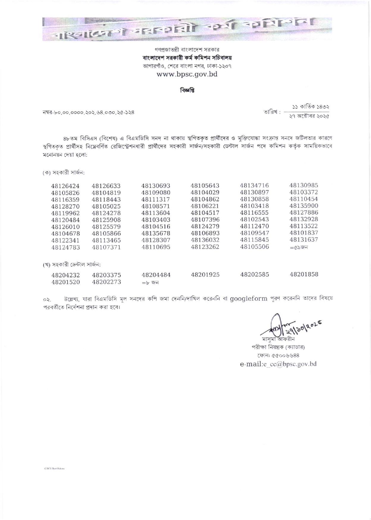 প্রিয় চাকরিপ্রত্যাশীগণ, আপনাদের অবগতির জন্য জানানো যাচ্ছে যে, ৪৮তম বিসিএস স্থগিতকৃত প্রার্থীদের মনোনয়ন প্রদান সংক্রান্ত বিজ্ঞপ্তি প্রকাশিত হয়েছে। বিজ্ঞপ্তি অনুসারে, ৪৮তম বিসিএস (বিশেষ) এ বিএমডিসি সনদ না থাকায় স্থগিতকৃত প্রার্থীদের ও মুক্তিযোদ্ধা সংক্রান্ত সনদে জটিলতার কারণে স্থগিতকৃত প্রার্থীসহ মোট ৬৭ জন প্রার্থীকে সহকারী সার্জন/সহকারী ডেন্টাল সার্জন পদে কমিশন সাময়িকভাবে মনোনয়ন দেয়া হয়েছে।