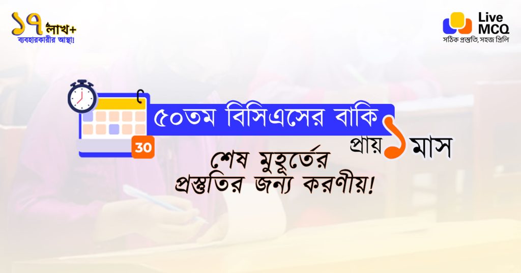 ৫০তম বিসিএস প্রিলিমিনারি পরীক্ষার আগের এই এক মাসে পুরোদমে রিভিশন চালিয়ে যান। Live MCQ অ্যাপের ৫০তম বিসিএস রুটিনগুলো অনুসরণ করুন ও নিয়মিত লাইভ পরীক্ষা দিন।