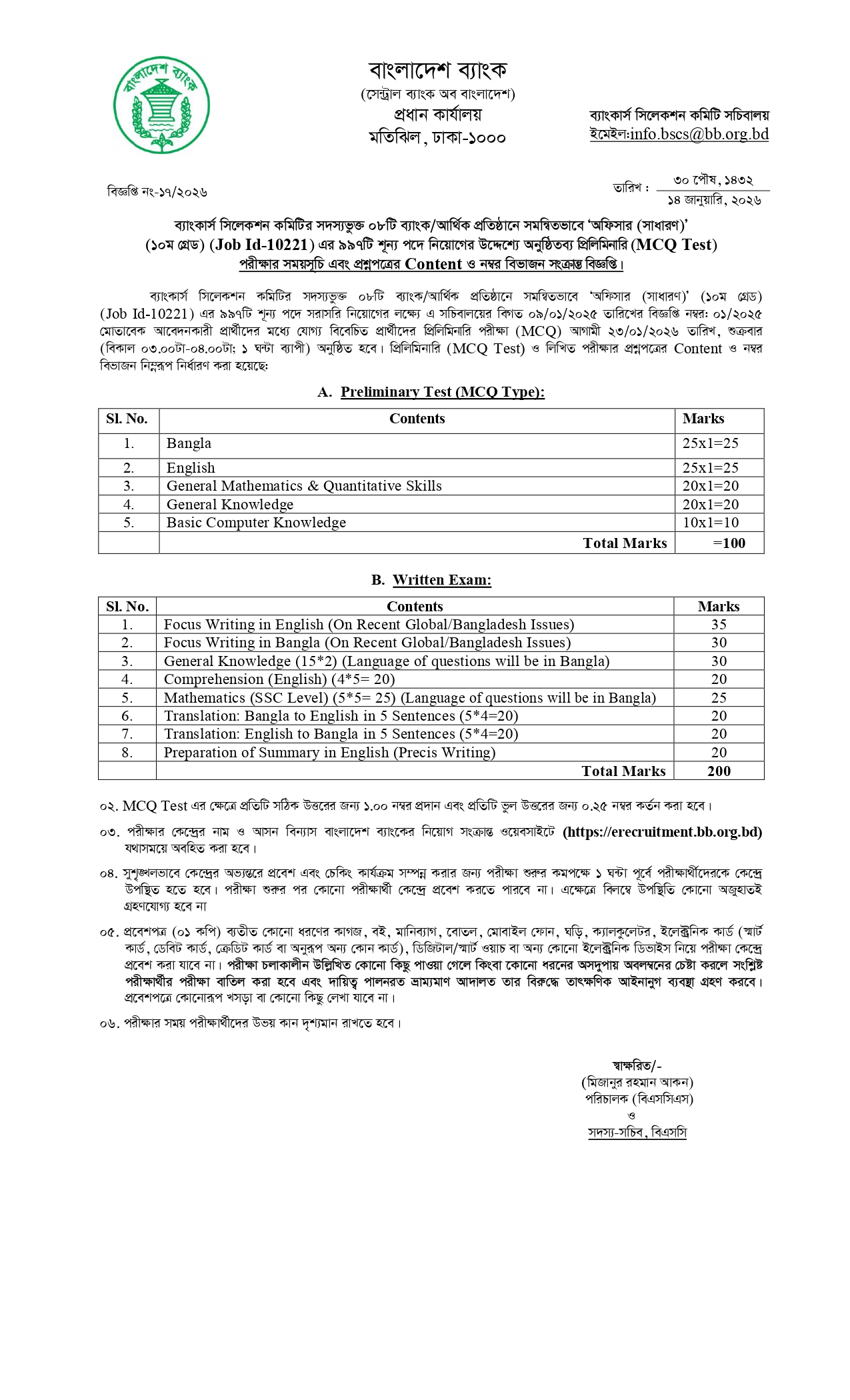 প্রিয় চাকরিপ্রত্যাশীগণ, আপনাদের অবগতির জন্য জানানো যাচ্ছে যে, সমন্বিত ৮ ব্যাংক অফিসার সাধারণ প্রিলি পরীক্ষার সময়সূচি প্রকাশ হয়েছে। বিজ্ঞপ্তি অনুসারে, ব্যাংকার্স সিলেকশন কমিটি’র অন্তর্ভুক্ত ০৮ টি ব্যাংক/আর্থিক প্রতিষ্ঠানে ‘অফিসার (সাধারণ)’ Job ID-10221 এর ৯৯৭টি শূন্য পদে প্রিলি পরীক্ষা অনুষ্ঠিত হবে আগামী ২৩ জানুয়ারি ২০২৬ তারিখে।