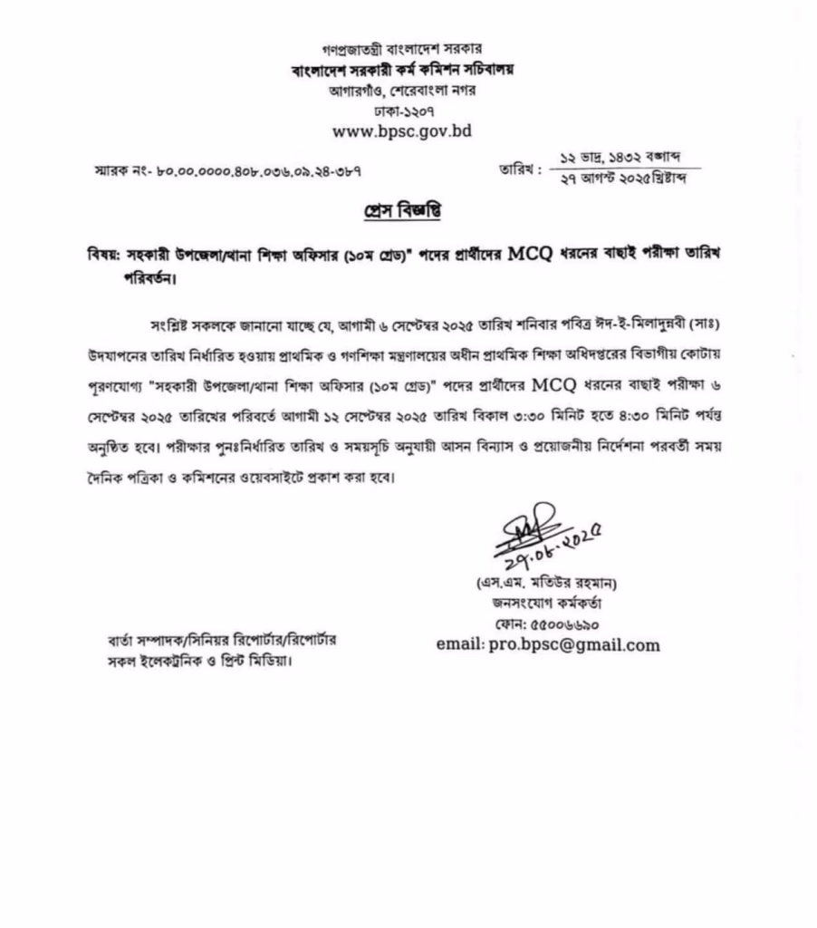 প্রিয় চাকরির প্রত্যাশীগণ, আপনাদের অবগতির জন্য জানানো যাচ্ছে যে, সহকারী উপজেলা / থানা শিক্ষা অফিসার ATEO প্রিলি পরীক্ষার তারিখ প্রাকাশিত হয়েছে। বিজ্ঞপ্তি অনুসারে, প্রাথমিক ও গণশিক্ষা মন্ত্রণালয়ের অধীন প্রাথমিক শিক্ষা অধিদপ্তরের “সহকারী উপজেলা/থানা শিক্ষা অফিসার” [বিভাগীয় কোটায় পূরণযোগ্য] পদে নিয়োগের জন্য অনলাইনে আবেদনকারী বিভাগীয় প্রার্থীদের MCQ Type বাছাই পরীক্ষা আগামী ১২ সেপ্টেম্বর, ২০২৫ তারিখ (শনিবার) বিকাল ৩: ৩০ মিনিট থেকে ৪: ৩০ মিনিট পর্যন্ত অনুষ্ঠিত হবে। পরীক্ষার আসনবিন্যাস ও সংশ্লিষ্ট গুরুত্বপূর্ণ নির্দেশনাসমূহ পরবর্তীতে যথাসময়ে পিএসসির এবং Live MCQ সাইটে প্রকাশ করা হবে। এর পূর্বে ৬ সেপ্টেম্বর, ২০২৫ তারিখ (শনিবার) সকাল ১১ টা থেকে দুপুর ১২টা পর্যন্ত উক্ত পরীক্ষা অনুষ্ঠিত হবার কথা ছিলো।