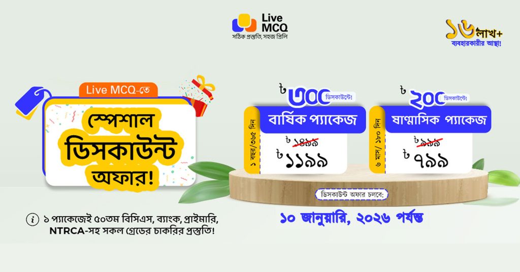Offers Live MCQ বার্ষিক ও ষাণ্মাসিক প্রিমিয়াম প্যাকেজে চলছে স্পেশাল ডিসকাউন্ট অফার 🥳 Live MCQ প্রিমিয়াম প্যাকেজে বছরের শেষ স্পেশাল ডিসকাউন্ট অফার! 🔥 💥 Live MCQ প্রিমিয়াম প্যাকেজে চলছে এই বছরের সর্বশেষ Live MCQ November 10, 2025
