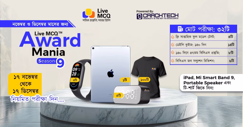 দ্রষ্টব্য: বিশেষ ক্ষেত্রে Live MCQ কর্তৃপক্ষ Award Mania : Season ⎯ ৯ এর Award প্রদান বিষয়ে যেকোনো ধরনের সিদ্ধান্ত গ্রহণের অধিকার সংরক্ষণ করে।