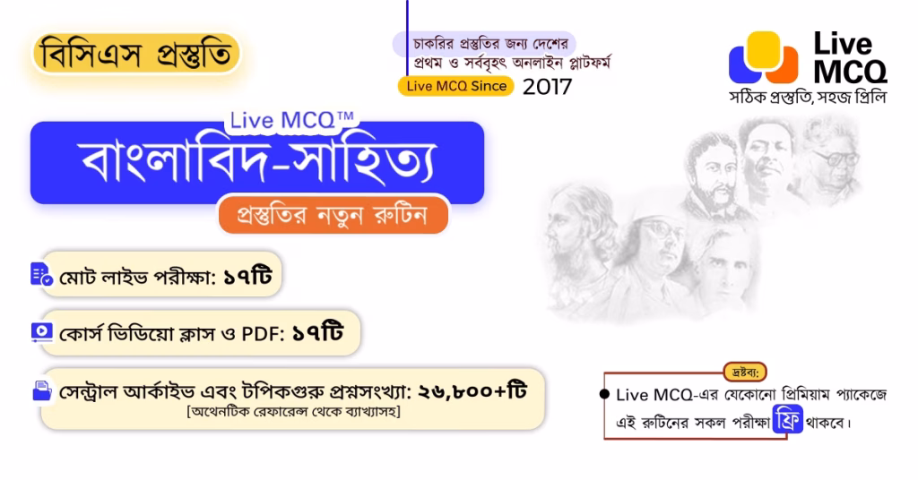 আপনারা জানেন, বিসিএস প্রিলিমিনারি পরীক্ষার সিলেবাসের বাংলা সাহিত্যের অংশ থেকে ২০ নম্বর থাকে। চূড়ান্ত পরীক্ষায় এই অংশে ভালো করার উপর অন্যদের তুলনায় এগিয়ে যাওয়া নির্ভর করে। আপনার প্রস্তুতির সুবিধার্থে Live MCQ অ্যাপে Subject Care বাটনে বিষয়ভিত্তিক প্রস্তুতির জন্য সকল বিষয়ের রুটিনে চক্রাকারে পরীক্ষা চলমান থাকে। বাংলাবিদ — বাংলা সাহিত্য অংশের জন্যও রয়েছে বিষয়ভিত্তিক প্রস্তুতির ব্যবস্থা।