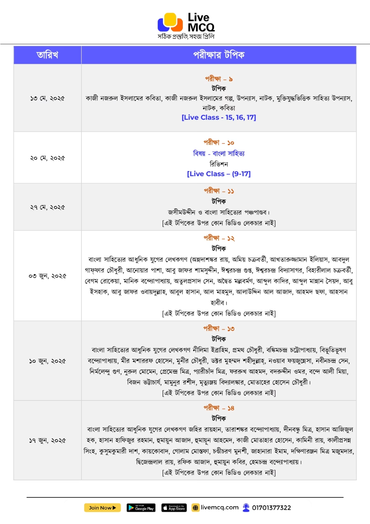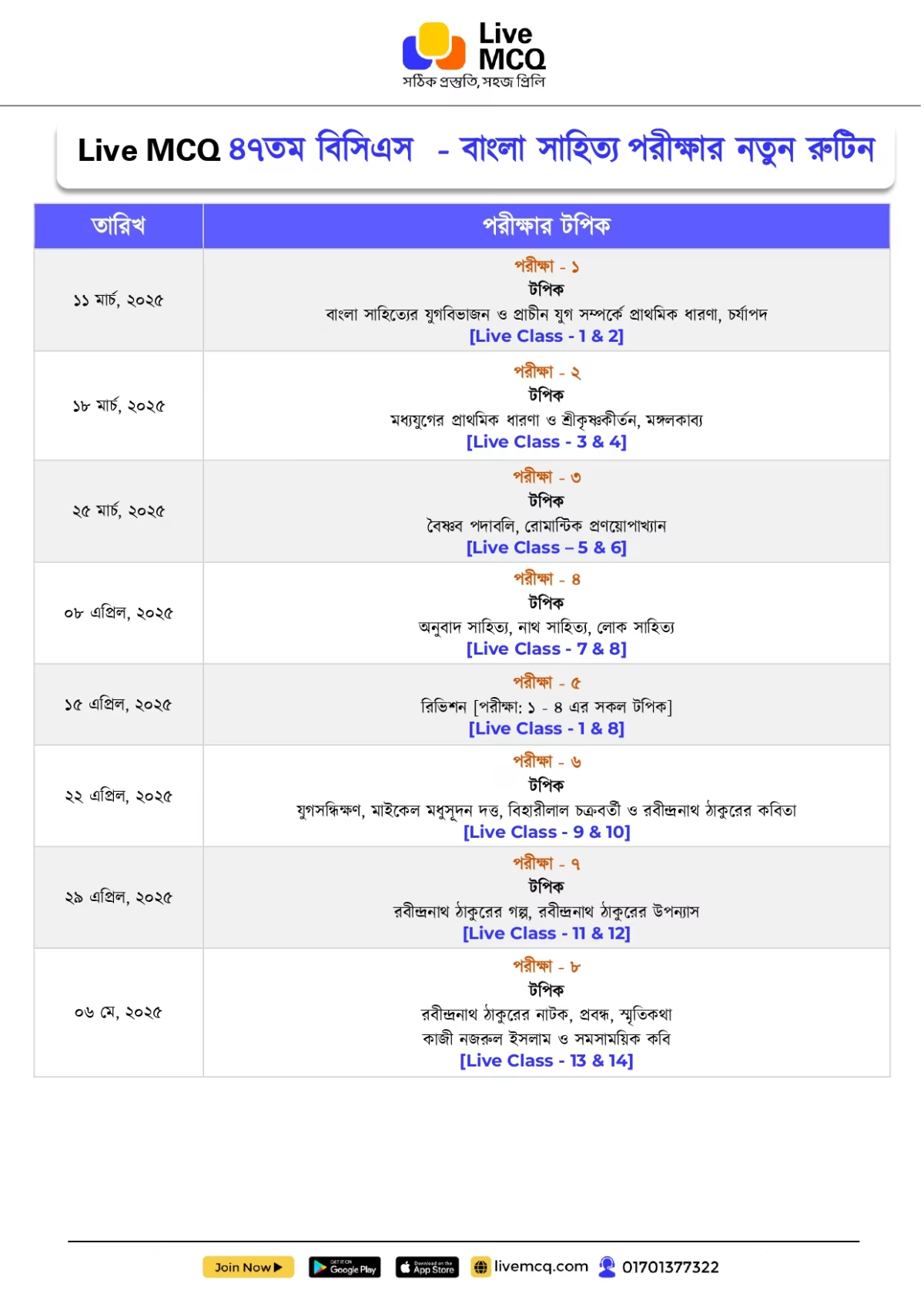 এছাড়া Live MCQ অ্যাপ বা সাইটের হোমপেজ → PDF Section → রুটিন ও কারিকুলাম অপশন থেকেও অ্যাপের সকল পরীক্ষার পিডিএফসমূহ ডাউনলোড কিংবা প্রিন্ট করে সংরক্ষণ করতে পারবেন। ক্লাস দেখে ও লেকচার PDF-গুলো থেকে পড়াশুনা করে পরীক্ষা দিয়ে প্রস্তুতি যাচাই করুন। ভালো ফলাফলের জন্য অবশ্যই বোর্ড বই ও অন্যান্য অথেনটিক রেফারেন্স থেকে বিস্তারিত পড়াশুনা করুন। আশা করি নতুন এই রুটিনের পরীক্ষাগুলো আপনার প্রস্তুতিকে আরো একধাপ এগিয়ে দিবে।