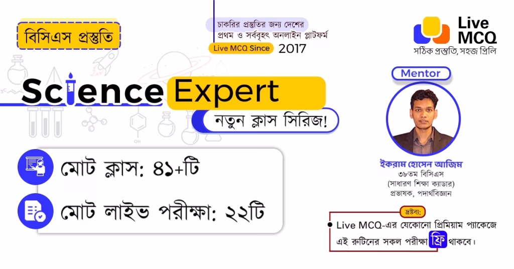 Live MCQ-তে ইতোমধ্যে বিসিএসের সকল সাবজেক্টের ক্লাস এবং পরীক্ষা চলমান আছে। তবে আমরা নতুন আঙ্গিকে বিজ্ঞান অংশের ক্লাস পুনরায় শুরু করছি। Science Expert-এর নতুন এই ক্লাস সিরিজে বিসিএসের বিজ্ঞান অংশের সিলেবাসকে ছোট ছোট টপিকে ভাগ করে সাজানো হয়েছে। পাশাপাশি থাকবে ক্লাসগুলোর উপর লাইভ পরীক্ষা।