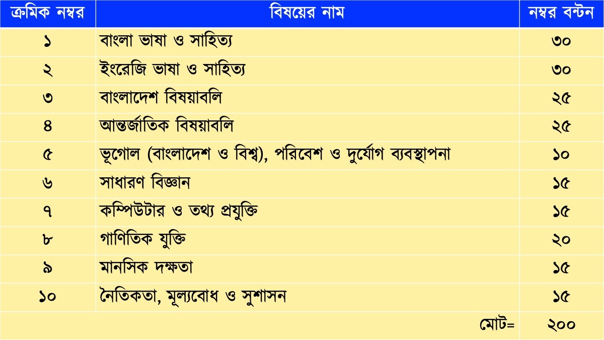 আবার সাধারণ বিজ্ঞান এবং কম্পিউটার ও তথ্যপ্রযুক্তি দুটি বিষয়ে ১৫ নম্বর করে মোট থাকে ৩০ নম্বর। সাধারণ জ্ঞান অংশের বাংলাদেশ বিষয়াবলি ও আন্তর্জাতিক বিষয়াবলিতে থাকে ২৫ নম্বর করে। এছাড়া ভূগোল, পরিবেশ ও দুর্যোগ ব্যবস্থাপনা বিষয়ে ১০ নম্বর এবং নৈতিকতা, মূল্যবোধ ও সুশাসন বিষয় দুটির জন্য বরাদ্দ থাকে ১৫ নম্বর।