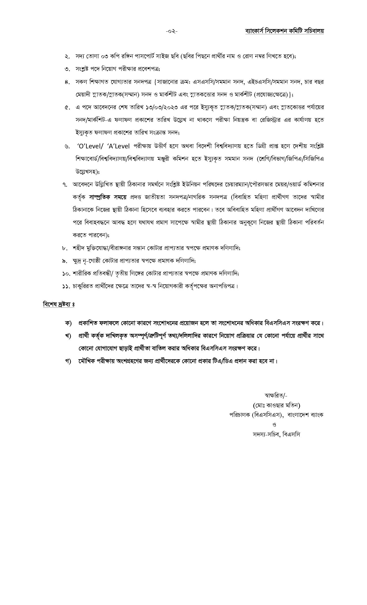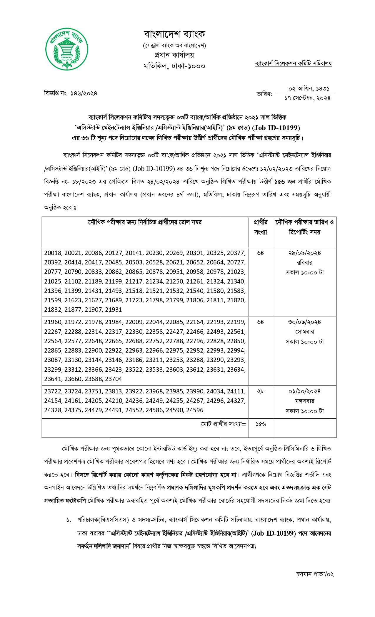 ১২ ফেব্রুয়ারি ২০২৩ তারিখের নিয়োগ বিজ্ঞপ্তি নং- ১৮/২০২৩ এর প্রেক্ষিতে বিগত ২৪ ফেব্রুয়ারি ২০২৪ তারিখে অনুষ্ঠিত লিখিত পরীক্ষায় উত্তীর্ণ ১৫৬ জন প্রার্থীর মৌখিক পরীক্ষা বাংলাদেশ ব্যাংক, প্রধান কার্যালয় (প্রধান ভবনের ৪র্থ তলা), মতিঝিল, ঢাকায় নির্ধারিত তারিখ এবং সময়সূচি অনুযায়ী অনুষ্ঠিত হবে।