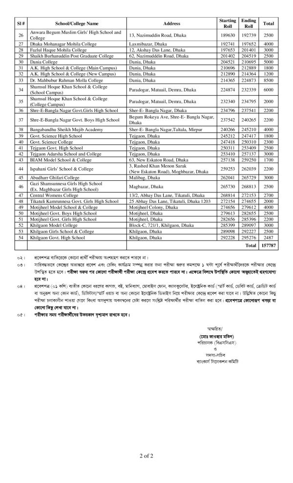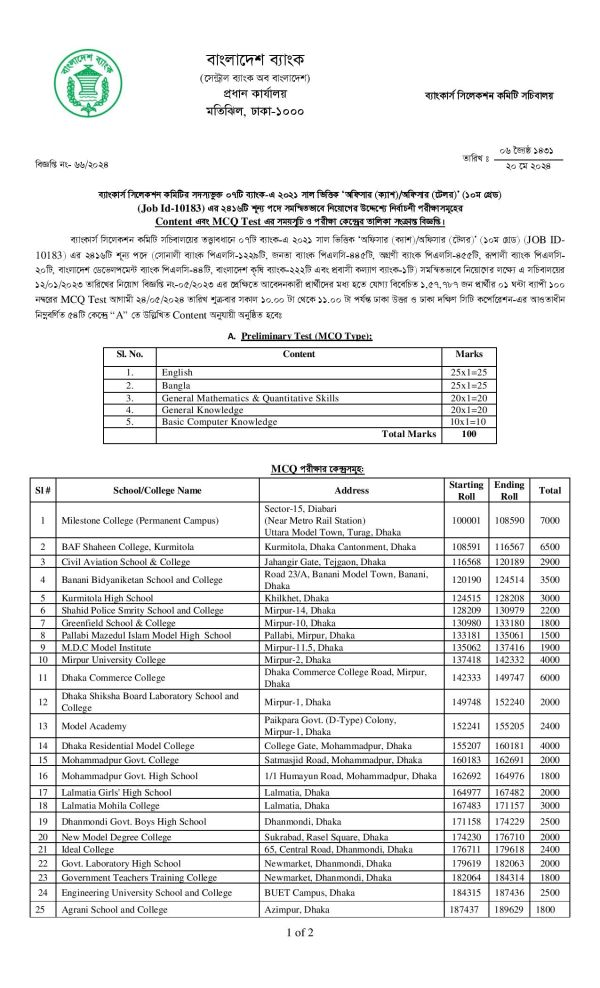 সমন্বিত ৭ ব্যাংকের ক্যাশ অফিসার টেলর পদের প্রিলিমিনারি পরীক্ষার কেন্দ্র তালিকা প্রকাশিত হয়েছে। আগামী ২৪ মে ২০২৪ তারিখে সকাল ১০.০০ ঘটিকা থেকে ১১.০০ ঘটিকা পর্যন্ত ঘন্টাব্যাপী ১০০ নম্বরের এই প্রিলিমিনারি পরীক্ষা অনুষ্ঠিত হবে। যার মধ্যে ইংরেজিতে ২৫, বাংলায় ২৫, সাধারণ গণিতে ২০, সাধারণ জ্ঞানে ২০ এবং বেসিক কম্পিউটার স্কিলে ২০ নম্বর রয়েছে। ঢাকা উত্তর ও দক্ষিণ সিটি কর্পোরেশনের আওতাধীন ৫৪ টি কেন্দ্রে এই প্রিলিমিনারি পরীক্ষাটি অনুষ্ঠিত হবে। এই নিয়োগ পরীক্ষায় মোট শূন্য পদের সংখ্যা ২৪১৬ টি। ৫৪ টি কেন্দ্র তালিকা ও রোল নম্বর নিম্নে প্রকাশ করা হল।