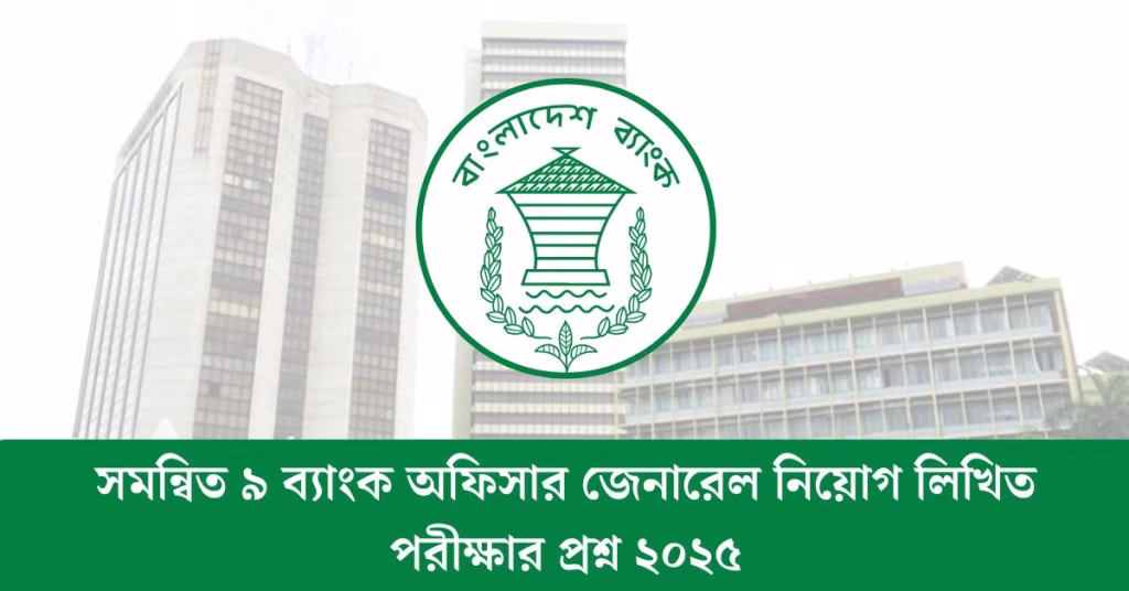 প্রিয় চাকরিপ্রত্যাশীগণ, আপনাদের অবগতির জন্য জানানো যাচ্ছে যে, সমন্বিত ৯ ব্যাংক অফিসার জেনারেল নিয়োগ লিখিত পরীক্ষার প্রশ্ন সংক্রান্ত ব্লগে আপনাদের স্বাগতম। আপনারা জানেন গত ১৫ আগস্ট, ২০২৫ তারিখে ২০২২ সাল্ভিত্তিক সমন্বিত ৯ ব্যাংক অফিসার জেনারেল নিয়োগ লিখিত পরীক্ষা অনুষ্ঠিত হয়েছে। আপনারা যারা ব্যাংক নিয়োগ পরীক্ষা প্রস্তুতি নিচ্ছেন তাদের সুবিধার্থে উক্ত পরীক্ষার প্রশ্নটি নিচে দেয়া হলো।