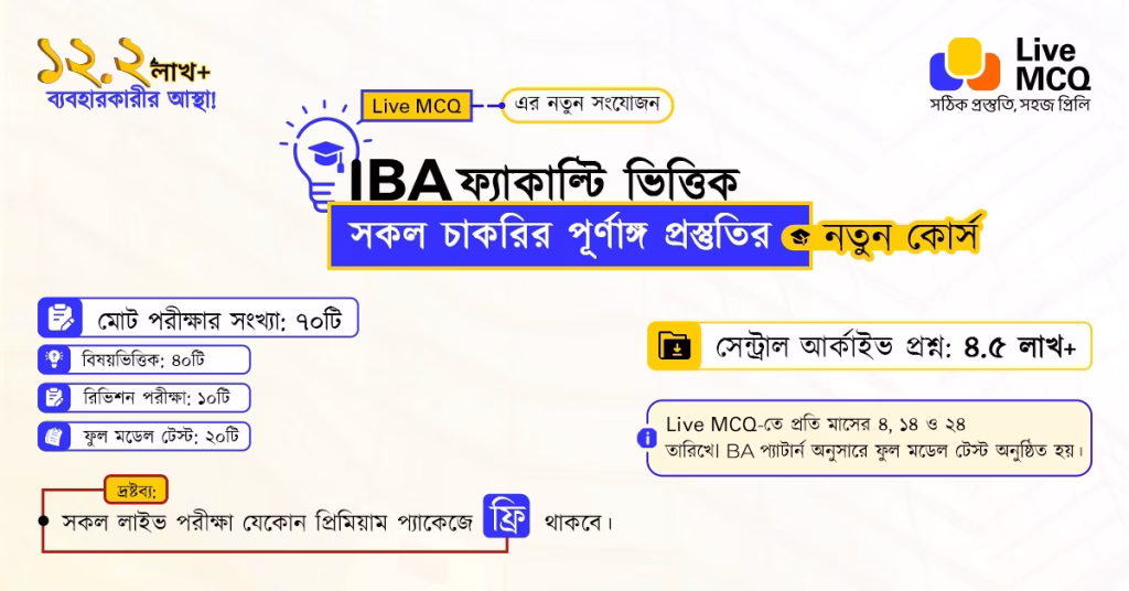 এছাড়াও Live MCQ – তে প্রতি মাসের ৪, ১৪ ও ২৪ তারিখে IBA প্যাটার্ন অনুসারে ফুল মডেল টেস্ট অনুষ্ঠিত হয়।