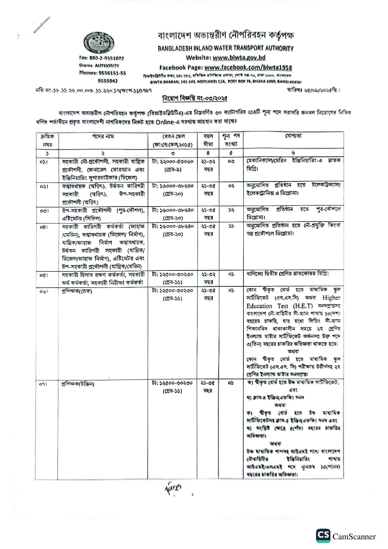 প্রিয় চাকরিপ্রত্যাশীগণ, আপনাদের অবগতির জন্য জানানো যাচ্ছে যে, বাংলাদেশ অভ্যন্তরীণ নৌপরিবহন কর্তৃপক্ষ নিয়োগ বিজ্ঞপ্তি প্রকাশিত হয়েছে। বিজ্ঞপ্তি অনুসারে, বাংলাদেশ অভ্যন্তরীণ নৌপরিবহন কর্তৃপক্ষ (BIWTA) এর ৩০ ক্যাটাগরির ২১৪টি শূন্য পদে সরাসরি জনবল নিয়োগ দেয়া হবে বলে জানানো হয়। যোগ্যতানুসারে আগ্রহী প্রার্থীগণ ৮ অক্টোবর থেকে ৭ নভেম্বর, ২০২৫ তারিখ পর্যন্ত অনলাইনে আবেদন করতে পারবেন।