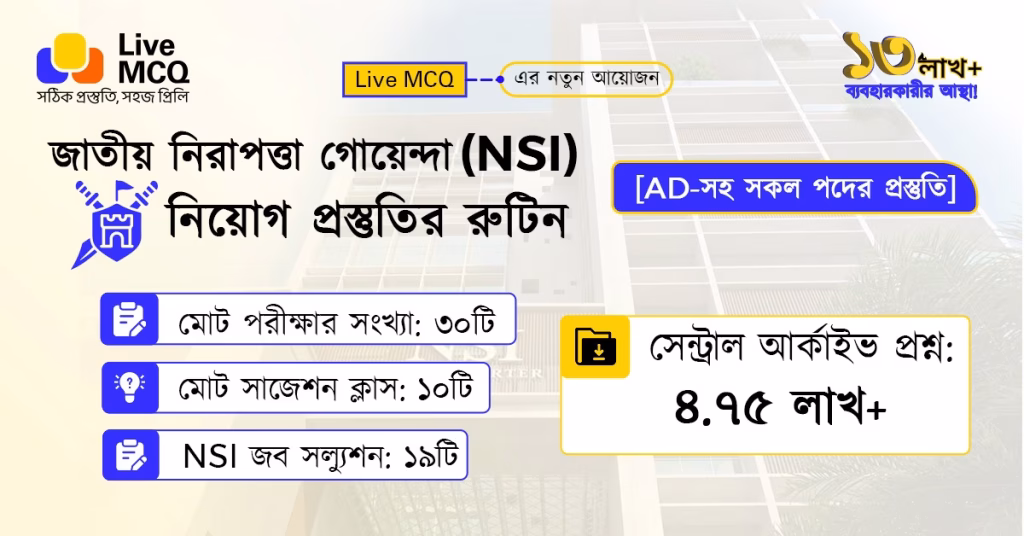 উল্লেখ্য, Live MCQ-এর যেকোন প্রিমিয়াম প্যাকেজ থাকলে NSI প্রস্তুতির সকল পরীক্ষা ফ্রি থাকবে। মূল পরীক্ষার তারিখ ঘোষণা করা হলে রুটিন সমন্বয় করা হবে এবং মডেল টেস্ট-এর সংখ্যা বাড়ানো হতে পারে। আশা করি, আমাদের এই নতুন আয়োজন আপনার NSI-এর প্রস্তুতিকে গোছানো, সুন্দর ও শাণিত করবে। নতুন উদ্যমে NSI প্রস্তুতি শুরু হোক দেশের বৃহত্তম চাকরির প্রস্তুতি প্ল্যাটফর্ম Live MCQ অ্যাপে!