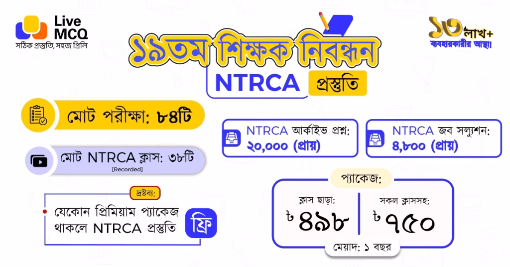 ১৯তম শিক্ষক নিবন্ধনের বিজ্ঞপ্তি এই বছরেই হয়ে যাওয়ার সম্ভাবনা অনেক বেশি। তাই দেরি না করে প্রস্তুতি শুরু করা উচিত এখন থেকেই। Live MCQ-তে NTRCA-এর সিলেবাস বিশ্লেষণ করে সেগুলো ছোট ছোট ভাগে রুটিন তৈরি করা হয়েছে। পাশাপাশি সকল সাবজেক্টের ভিডিও ক্লাস ও লেকচার PDF-এর মাধ্যমে পূর্ণাঙ্গ প্রস্তুতির ব্যবস্থা রয়েছে।