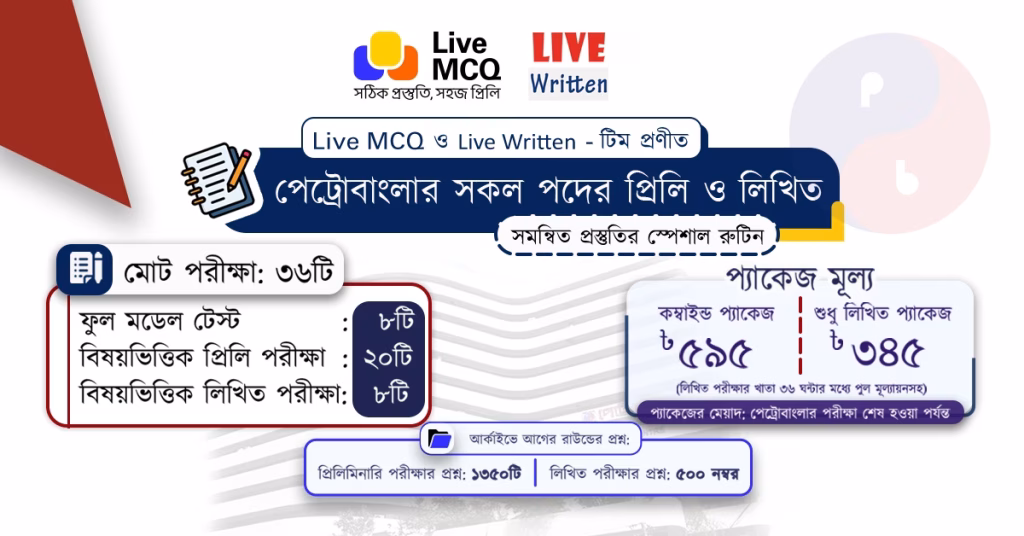 পেট্রোবাংলার অবশিষ্ট ৯ পদের পরীক্ষাকে কেন্দ্র করে বর্তমানে আমাদের Live MCQ ও Live Written অ্যাপে পেট্রোবাংলার প্রিলি ও লিখিত সমন্বিত প্রস্তুতির স্পেশাল রুটিন প্রকাশ করা হয়েছে। সমন্বিত রুটিন অনুসারে ইতোমধ্যেই অ্যাপে পরীক্ষা চলমান আছে।