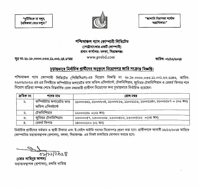 পশ্চিমাঞ্চল গ্যাস কোম্পানি নিয়োগ পরীক্ষার চূড়ান্ত ফলাফল ২০২৪
