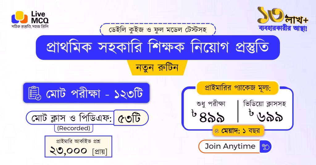 প্রিয় ব্যবহারকারীগণ, আশা করি সবাই ভালো আছেন, সুস্থ আছেন এবং পড়াশোনার সাথেই আছেন। সবাইকে Live MCQ টিমের পক্ষ থেকে শুভেচ্ছা। আপনারা ইতোমধ্যে জানেন যে, প্রাথমিক ও গণশিক্ষা উপদেষ্টার স্টেটমেন্ট অনুসারে, আগামী এপ্রিল মাসে প্রকাশিত হবে ২০২৫ সালের প্রাথমিক শিক্ষক নিয়োগ বিজ্ঞপ্তি। বিজ্ঞপ্তি প্রকাশিত হওয়ার পর খুব অল্প সময় পাওয়া যাবে প্রস্তুতির জন্য। তাই, অন্যদের তুলনায় এগিয়ে থাকতে প্রস্তুতি শুরু করতে হবে এখন থেকেই।