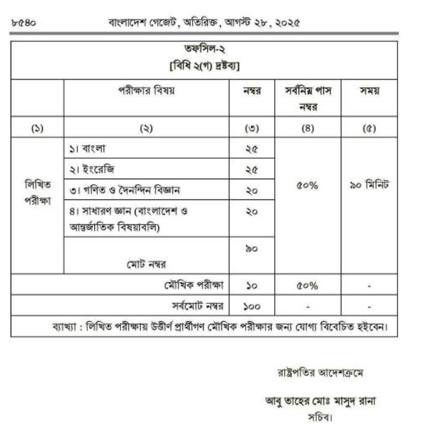 গেজেটে ৯০ নম্বরের মান বণ্টন তুলে ধরা হয়েছে। যেখানে বাংলা ২৫, ইংরেজি ২৫, বিজ্ঞান ও গণিত মিলে ২০, জিকে ২০ নম্বর। কিন্তু, সিলেবাস পূর্বেরটাই রাখা হয়েছে। নতুন কোনো সিলেবাস দেওয়া হয় নি। ধন্যবাদ।