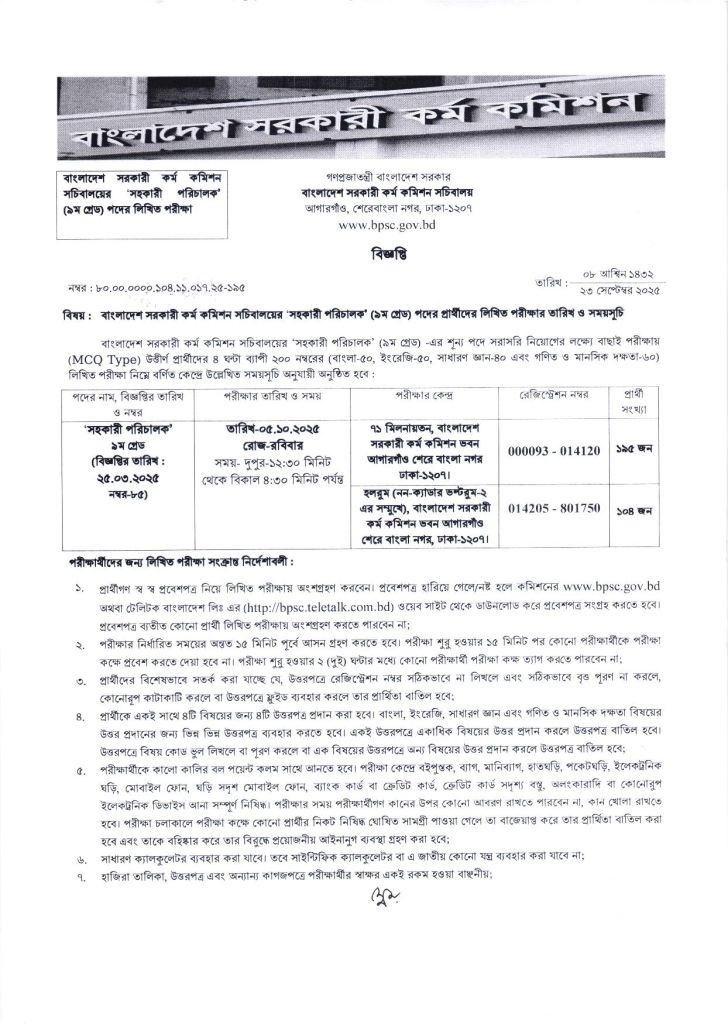 প্রিয় চাকরিপ্রত্যাশীগণ, আপনাদের অবগতির জন্য জানানো যাচ্ছে যে, পিএসসি সহকারী পরিচালক পদে লিখিত পরীক্ষার সময়সূচি ২০২৫ প্রকাশিত হয়েছে। বিজ্ঞপ্তি অনুসারে, বাংলাদেশ সরকারী কর্ম কমিশন সচিবালয়ের ৯ম গ্রেডভুক্ত “সহকারী পরিচালক” পদের নিয়োগের লক্ষ্যে ১ম ধাপের প্রিলিমিনারি পরীক্ষায় উত্তীর্ণ ২৯৯ জন প্রার্থীর লিখিত পরীক্ষা আগামী ৫ অক্টোবর, ২০২৫ তারিখে (রবিবার) দুপুর ১২:৩০ মিনিট থেকে বিকাল ৪:৩০ মিনিট পর্যন্ত অনুষ্ঠিত হবে বলে জানানো হয়েছে। ২৩ সেপ্টেম্বর, ২০২৫ তারিখে বাংলাদেশ সরকারী কর্ম কমিশন কর্তৃক প্রকাশিত এক বিজ্ঞপ্তির মাধ্যমে এ তথ্য নিশ্চিত করা হয়েছে।