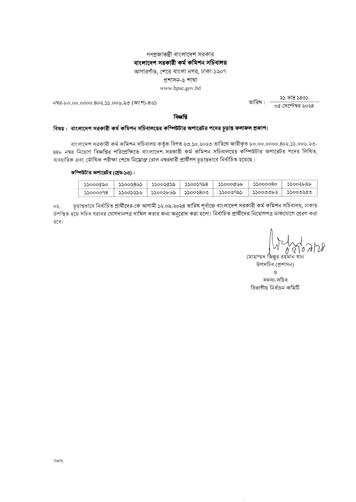 বাংলাদেশ সরকারি কর্ম কমিশন সচিবালয়ের কম্পিউটার অপারেটর পদের চূড়ান্ত ফলাফল ২০২৪