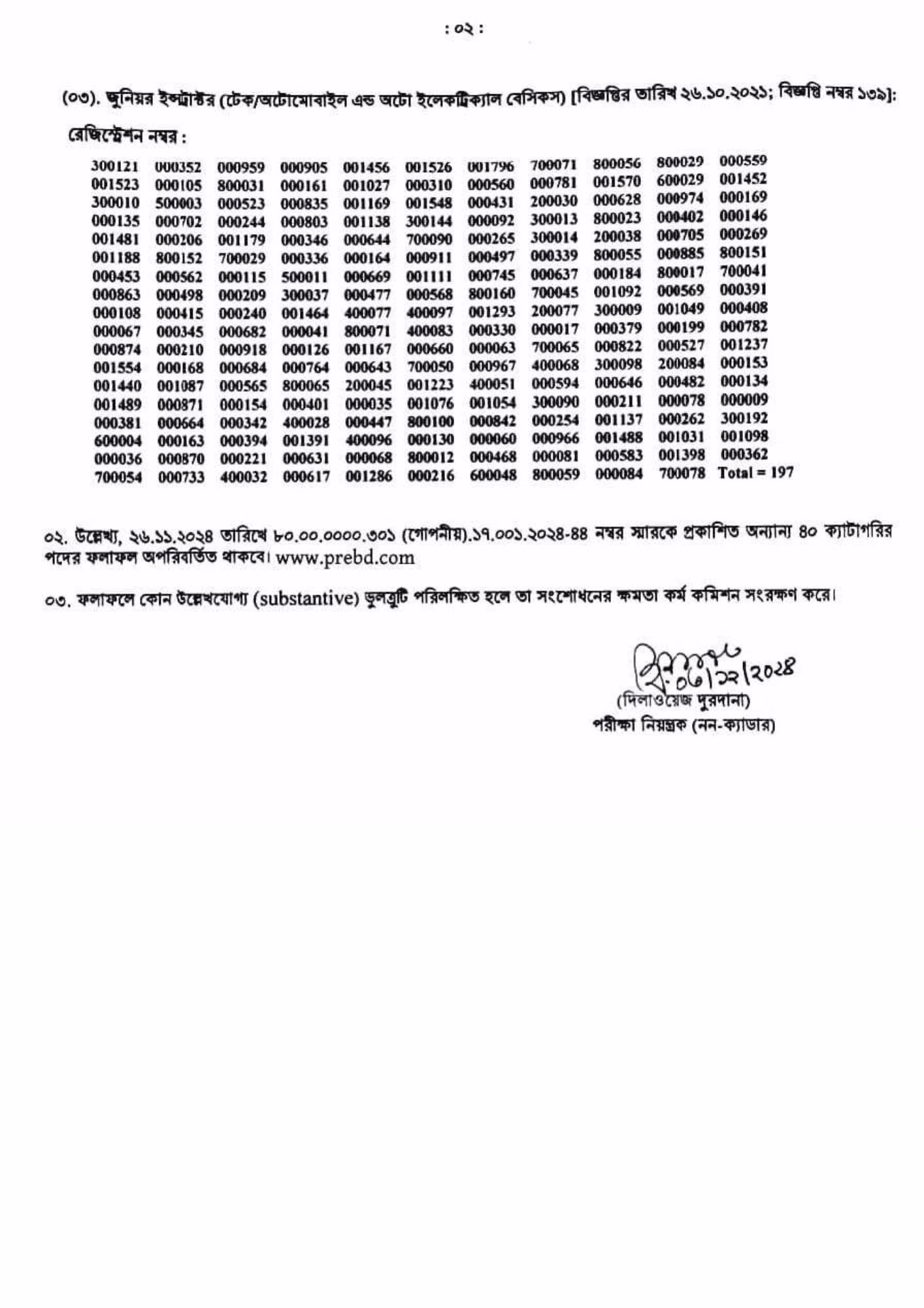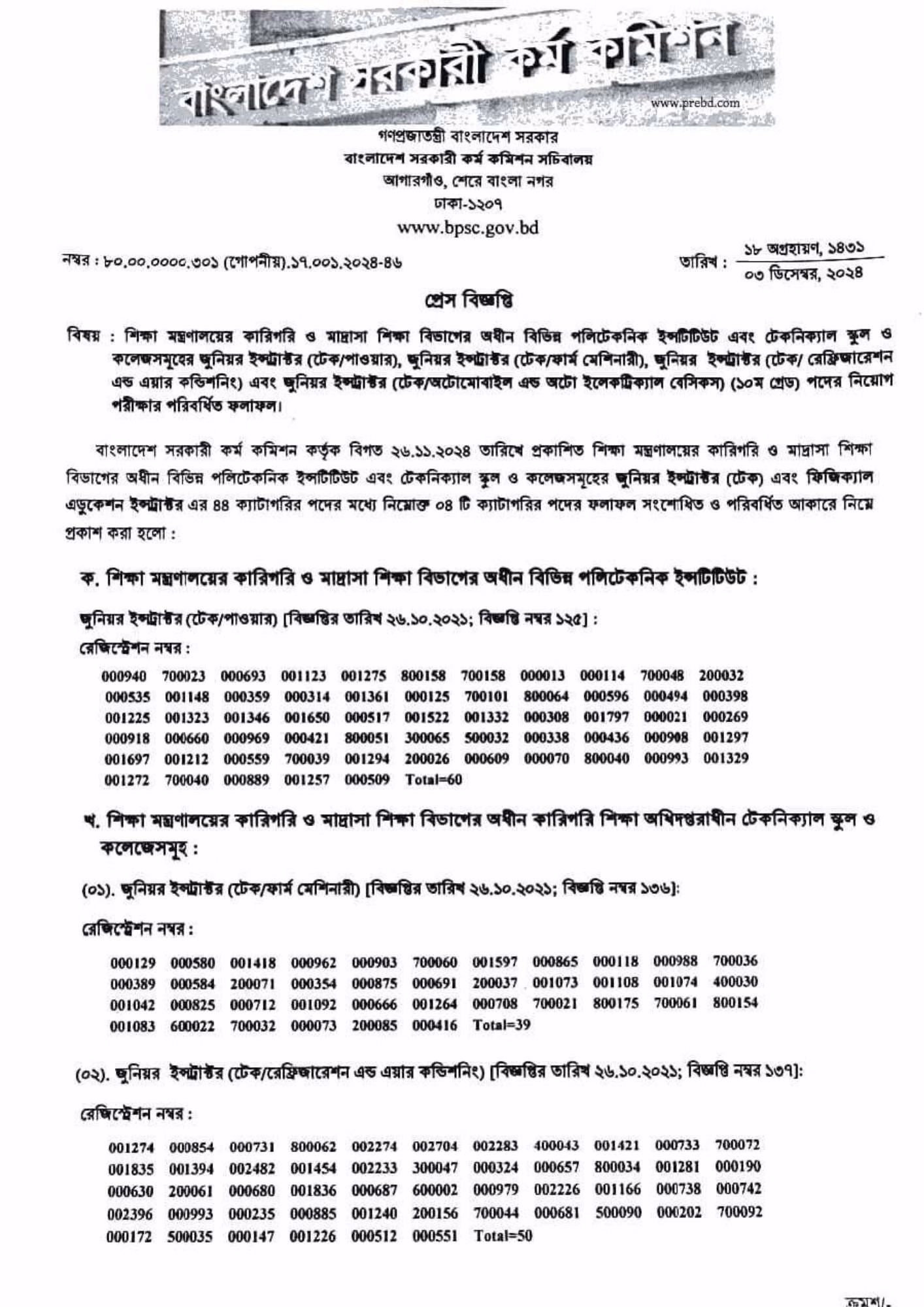 প্রিয় চাকরি প্রার্থীগণ বাংলাদেশ কর্ম কমিশনের অধীনে অনুষ্ঠিত হওয়া কারিগরি ও মাদ্রাসা বিভাগের অধীনে বিভিন্ন পলিটেকনিক স্কুল ও কলেজসমূহের জুনিয়র ইন্সট্রাক্টর (টেক/পাওয়ার), জুনিয়র ইন্সট্রাক্টর (টেক/ফার্ম মেশিনারী), জুনিয়র ইন্সট্রাক্টর (টেক / রেফ্রিজারেশন এন্ড ইয়ার কন্ডিশনিং) এবং জুনিয়র ইন্সট্রাক্টর (টেক/অটোমোবাইল এন্ড অটো ইলেকট্রিক্যাল বেসিকস পদের নিয়োগ পরীক্ষার পরিবর্ধিত ফলাফল প্রকাশিত হয়েছে। ৩ ডিসেম্বর ২০২৪ তারিখে একটি বিজ্ঞপ্তির মাধ্যমে এই বিষয় টি নিশ্চিত করে বাংলাদেশ সরকারি কর্ম কমিশন (পিএসসি)।