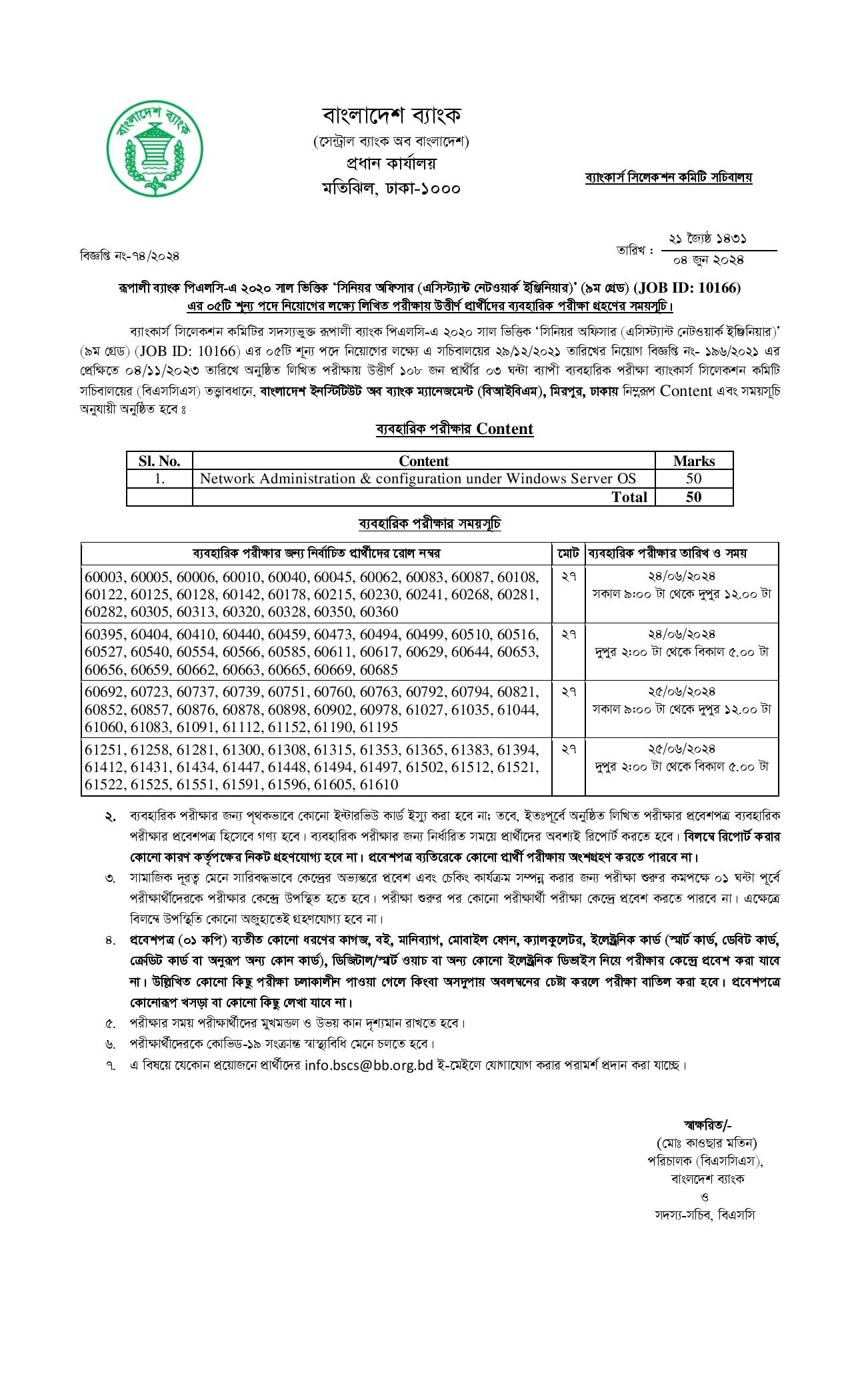 ব্যাংকার্স সিলেকশন কমিটির সদস্যভুক্ত রূপালী ব্যাংক পিএলসি – তে ২০২০ সালভিত্তিক সিনিয়র অফিসার (এসিস্ট্যান্ট নেটওয়ার্ক ইঞ্জিনিয়ার) পদের লিখিত পরীক্ষায় উত্তীর্ণ প্রার্থীদের ব্যাবহারিক পরীক্ষার সময়সূচি প্রকাশিত হয়েছে। উক্ত নিয়োগের Job ID 10166 এবং সরকারি বেতন স্কেল নবম গ্রেডের অন্তর্ভুক্ত। গত ৪/১১/২০২৩ তারিখে অনুষ্ঠিত হওয়া রূপালী ব্যাংকের সিনিয়র অফিসার (এসিস্ট্যান্ট নেটওয়ার্ক ইঞ্জিনিয়ার) লিখিত পরীক্ষায় উত্তীর্ণ ১০৮ জন প্রার্থীর ব্যাবহারিক পরীক্ষা আগামী ২৪ জুন এবং ২৫ জুন তারিখে নিম্নে উল্লেখিত সময়সূচি অনুযায়ী অনুষ্ঠিত হবে।