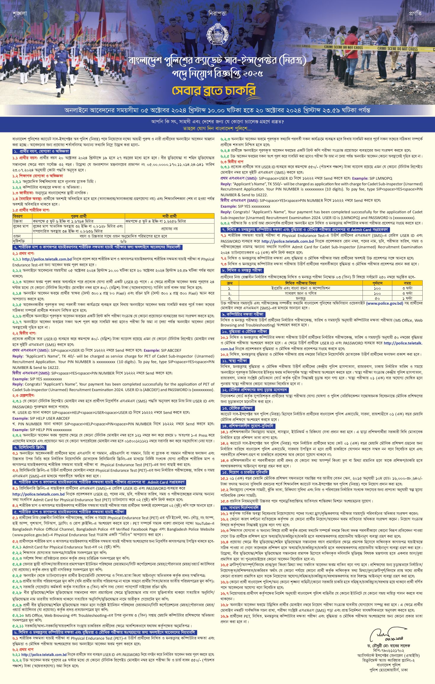 প্রিয় চাকরি প্রার্থীগণ, আপনারা জেনে আনন্দিত হবেন যে বিশাল সংখ্যক শূন্য পদে নিয়োগের লক্ষ্যে ২০২৫ সালভিত্তিক সাব ইন্সপেকটর নিয়োগ বিজ্ঞপ্তি প্রকাশিত হয়েছে। আগামী ৫ অক্টোবর ২০২৪ তারিখে থেকে অনলাইনে আবেদন কার্যক্রম শুরু হবে যা ২০ অক্টোবর ২০২৪ তারিখ পর্যন্ত চলমান থাকবে।