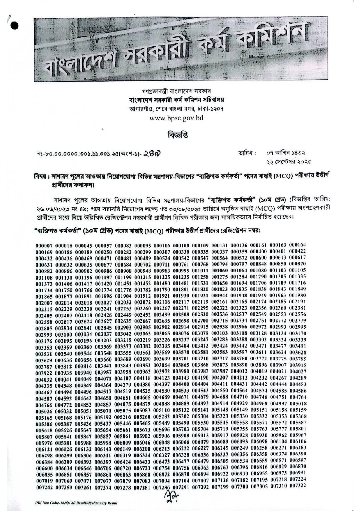 বিভিন্ন মন্ত্রণালয়ের ব্যক্তিগত কর্মকর্তা পদের প্রিলি পরীক্ষার ফলাফল