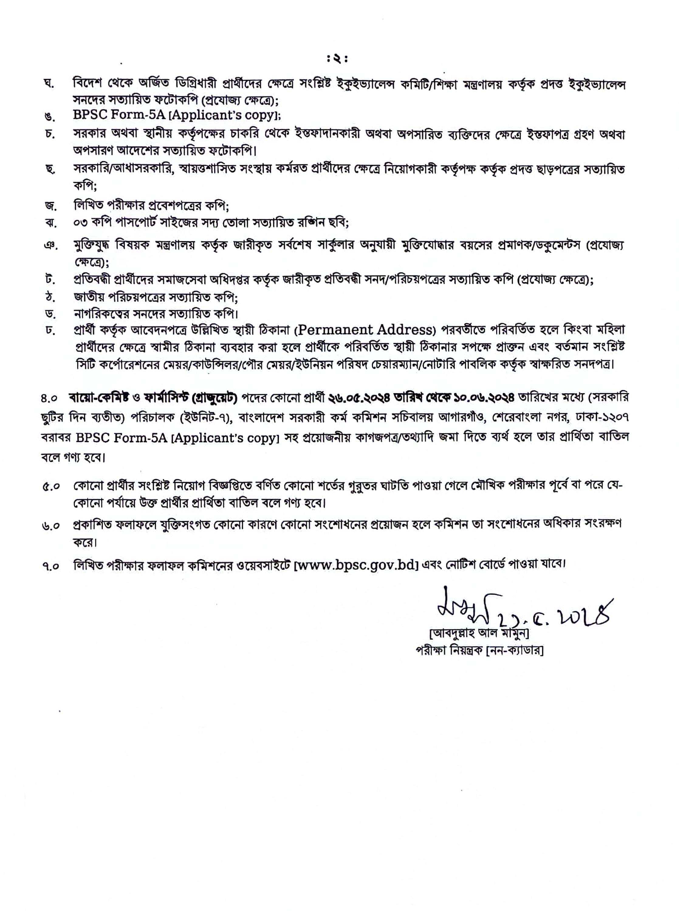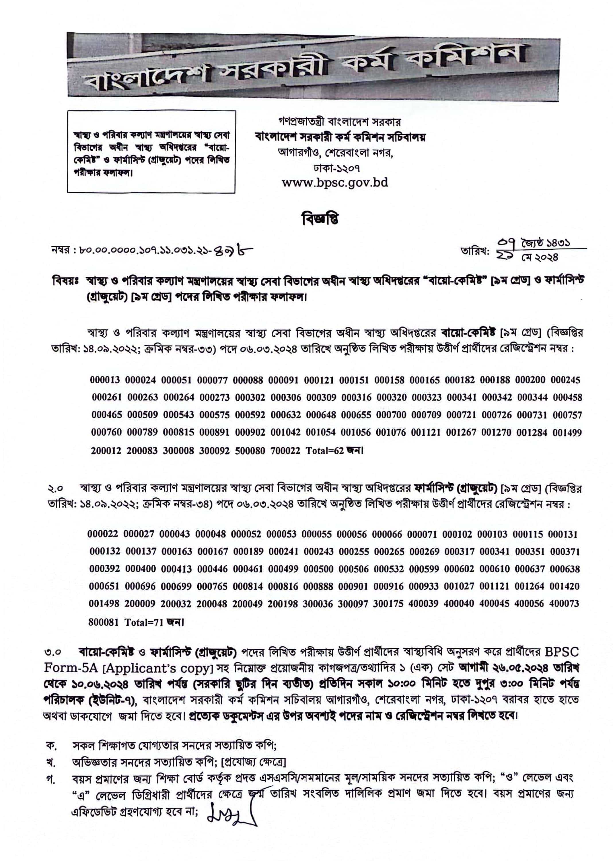 স্বাস্থ্য ও পরিবার কল্যাণ মন্ত্রণালয়য়ের স্বাস্থ্য সেবা বিভাগের অধীনে স্বাস্থ্য অধিদপ্তরের বায়ো-কেমিস্ট ও ফার্মাসিস্ট পদের লিখিত পরীক্ষার ফলাফল প্রকাশিত হয়েছে। এই ২ টি পদই সরকারি বেতন স্কেল ৯ম গ্রেডের অন্তর্ভুক্ত। যার মধ্যে বায়ো কেমিস্ট পদে ৬২ জন লিখিত পরীক্ষায় উত্তীর্ণ হয়েছেন। একই সাথে ফার্মাসিস্ট পদের লিখিত পরীক্ষায় ৭১ জন উত্তীর্ণ হয়েছেন। উত্তীর্ণ প্রার্থীদের Applicant Copy সহ প্রয়োজনীয় কাগজপত্র আগামী ২৬ মে ২০২৪ তারিখ থেকে ১০ জুন ২০২৪ তারিখের মধ্যে সরকারি ছুটির দিন ব্যাতিত প্রতিদিন সকাল ১০:০০ মিনিট থেকে দুপুর ৩:০০ মিনিট এর মধ্যে সরকারি কর্ম কমিশন সচিবালয় আগারগাঁও, শেরেবাংলা নগর, ঢাকা ১২০৭ বরাবর হাতে হাতে বা ডাকযোগে জমা প্রদান করার নির্দেশনা প্রদান করা হয়েছে।